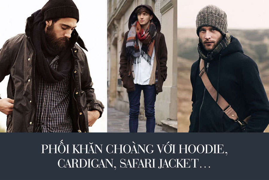 Một chiếc khăn choàng nhỏ sẽ khiến bộ trang phục với hoodie, safari jacket hay cardigan trông ngầu hơn. Hãy chọn một chiếc khăn có tông màu hoặc họa tiết khác biệt với tổng thể trang phục để tạo điểm nhấn, nhưng phải phù hợp với phụ kiện khác như kính, mũ… để tạo sự hài hoà trong trang phục.