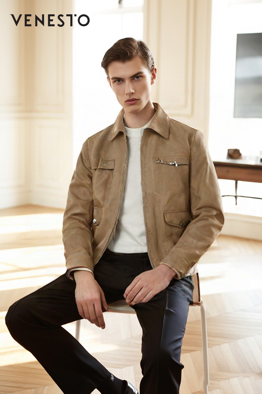 Áo khoác da nâu cổ bẻ phối đai