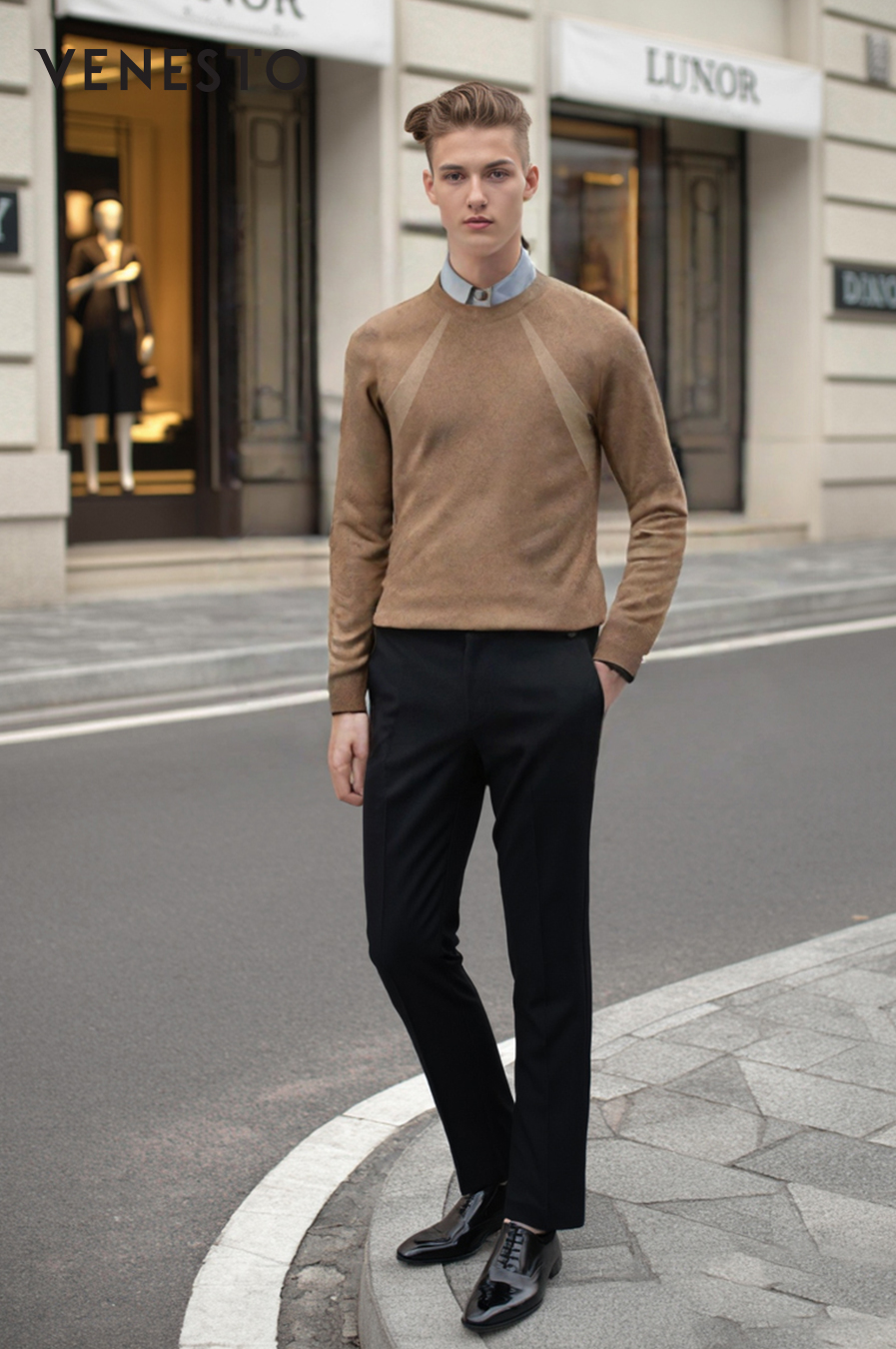 Áo thun len dệt kim nâu phối cổ