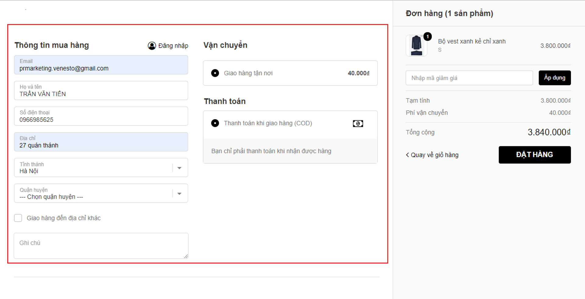 - Thực hiện đặt hàng bằng cách nhập thông tin thông tin mua hàng -> Đặt hàng
